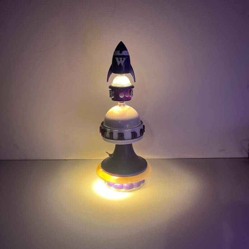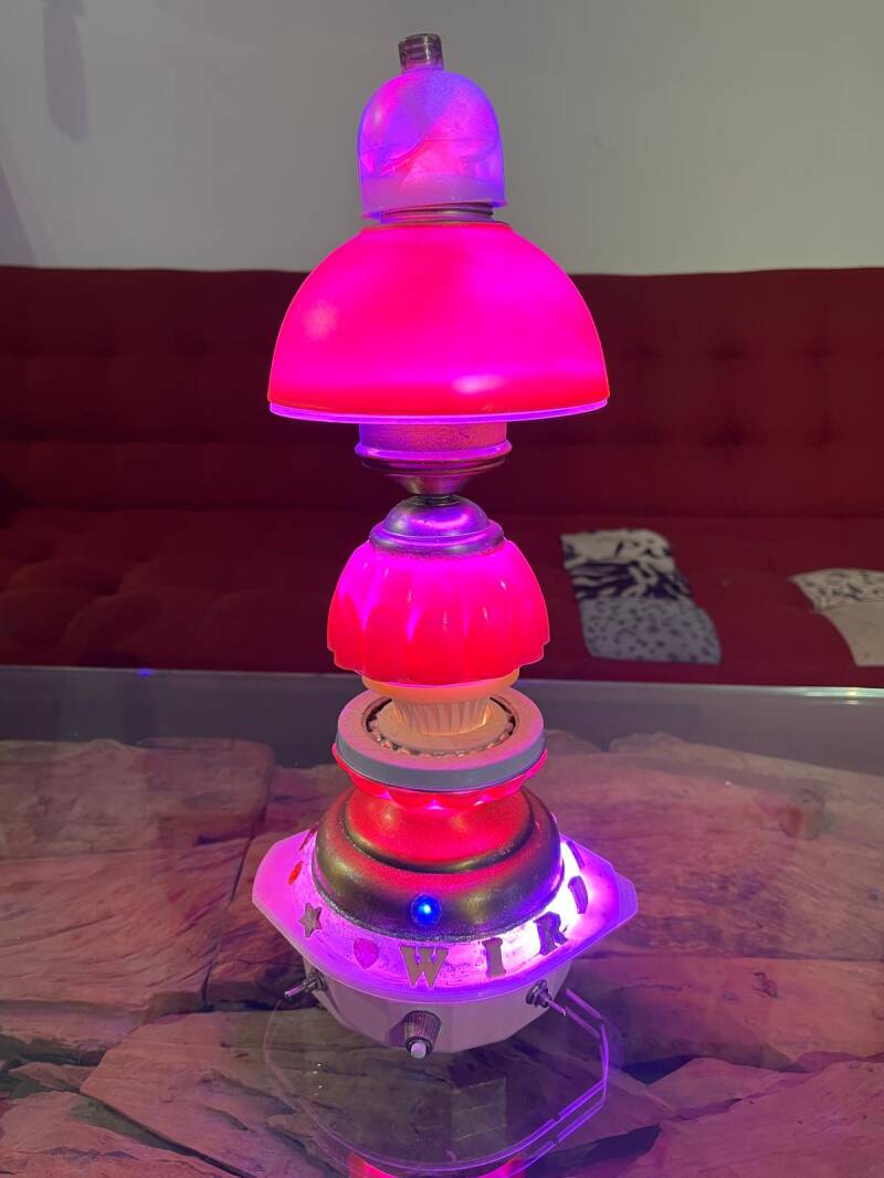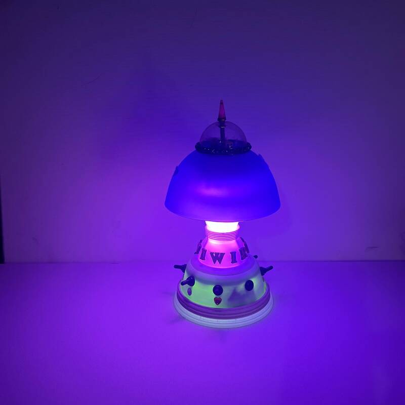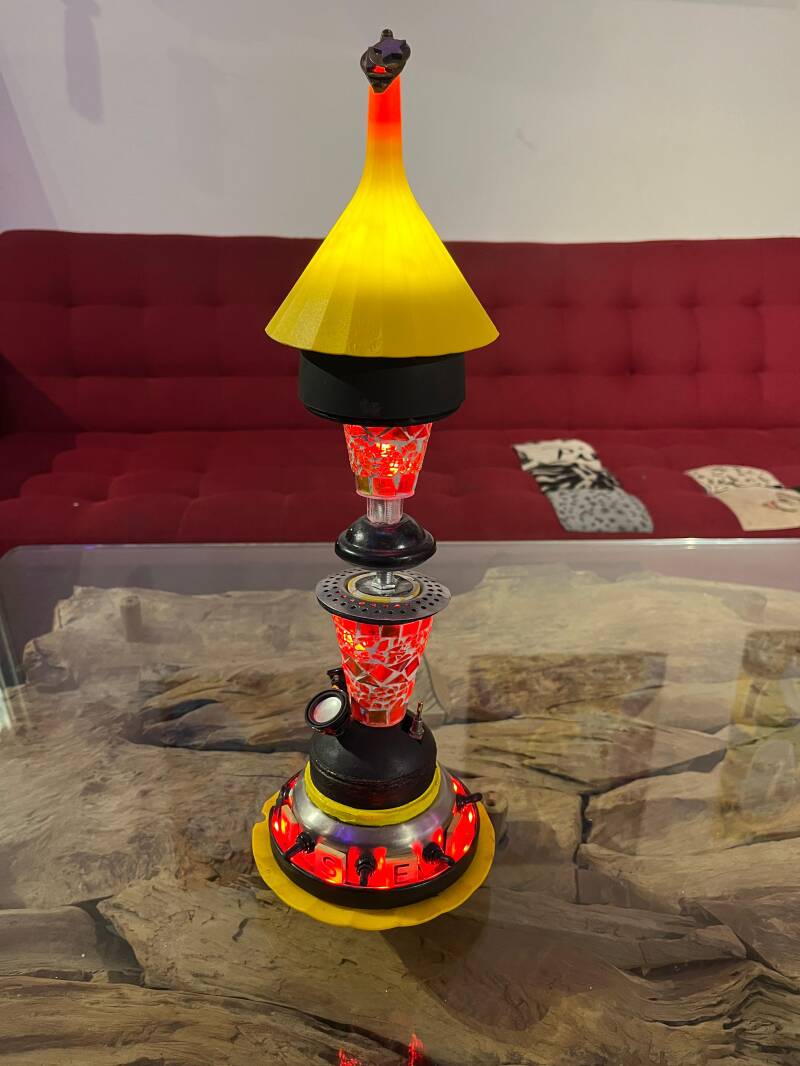 De Turtle Zodiac is de enige in zijn soort. de Turtle Zodiac staat symbool voor het verhaal dat alle wijsheid ter wereld wordt gedragen door een zeeschildpad. De lamp vooral ggemaakt van koper en hard plastic glas. de oudheid van de schildpad wordt ook gesymboliseerd door een soort zeewier- mosachtige groene glasscherven, die Wirdoselavi van een strandje heeft gered. de lamp kan in het mozaiek gedeelte paars, rood en blauw zijn. de lamp heeft 5 knopjes voor de verschillende elementen. met het groene midden is getracht een kwal uit te beelden, wat vrij goed gelukt is, al kunnen mensen misschien ook andere associaties hebben. de lamp is bijna 65 cm hoog. Als je de kop van de schildpad indrukt, is er een mogelijkheid om met bluetooth geluidsbestanden af te spelen. 5 Volt oplader bijgeleverd. Deze lamp vraagt een bieding omdat niet al de wijsheid komt door geld en vice versa.