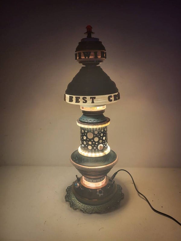 solide grote tafellamp met optie groen/wit en flame. 8 schakelaars voor wit en 1 voor groen.daarnaast een knop voor instant aan instant uit en voor de mono 5 watt box. oplaadbaar met dc 5 volt. oplader meegeleverd